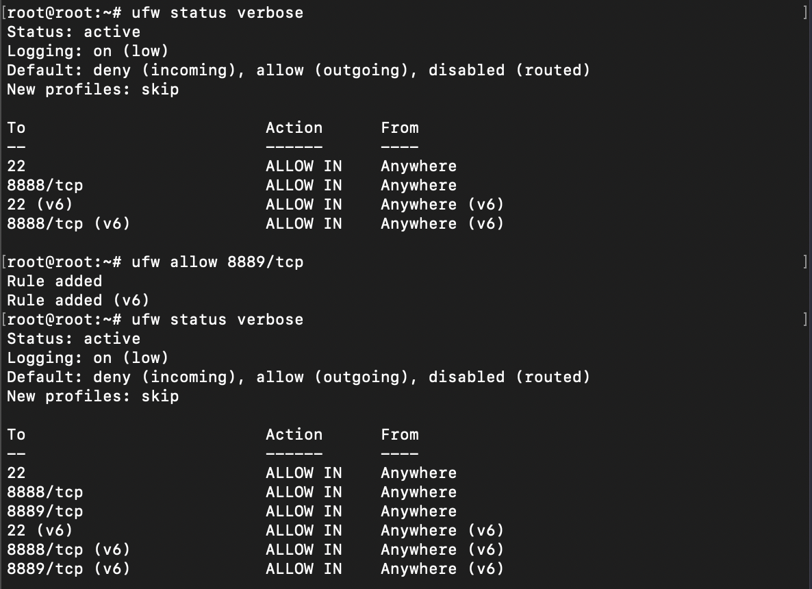먼저 ufw status verbose로 방화벽 상태를 확인해본다. 나는 기존에 8888포트를 허용해 놔서 22포트와 8888포트가 허용되어 있는 것으로 나왔는데 만약 기존에 하지 않았다면 22포트만 허용이 되어있었을거다. 그러면 ufw allow 8888/tcp를 입력해서 8888포트를 허용시켜주면된다!