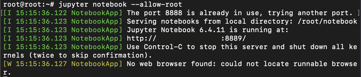 나는 8888포트로 하나 사용하고 있어서 자동으로 8889포트로 주피터 노트북이 실행되었다. 위 같은 메시지로 나왔다면 성공이다!