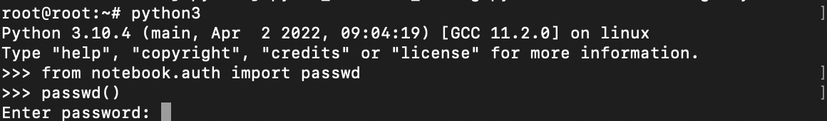 python의 passwd()함수를 실행하면 주피터 노트북을 실행할 때마다 사용할 비밀번호를 입력하고 한번 더 입력하고 나면 SHA~ 또는 argon~ 이런 해시값이 생성된다. 이 값을 복사해서 다른 곳에 저장해두자!