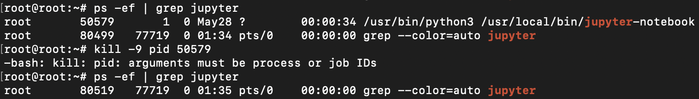 ps -ef | grep jupyer로 조회하면 위와 같이 나오는데 jupyter-notebook을 찾아서 두 번째에 있는 50579 같은 PID값으로 강제 종료하면된다.