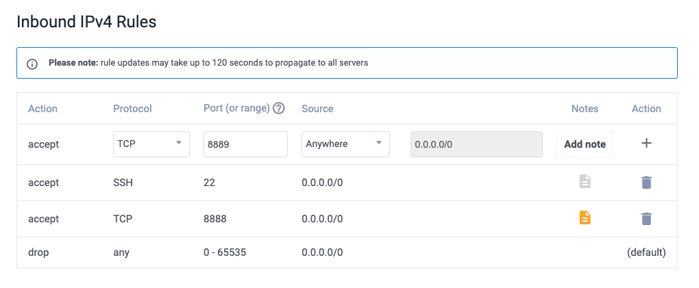 위에는 앞서말한 Vultr의 방화벽 설정화면인데 TCP 8888 0.0.0.0/0 이 세개만 잘 설정 해주면된다.