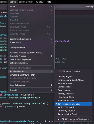 우선 ContentView에서 프리뷰로 본다면 아마 계속 런던만 나올건데 프리뷰에서는 위치권한을 동의할 수 없기 때문이다. 그래서 시뮬레이터나 아이폰을 직접 연결해서 테스트 할 수 있다. 실제 기기같은 경우에는 문제가 되지 않는데 시뮬레이터도 내 위치를 알 수 없다. 그럴땐 Xcode에서 시뮬레이터의 현재위치를 직접 바꿀수 있다. [Debug]탭 -> [Simulate Location] -> 지역선택