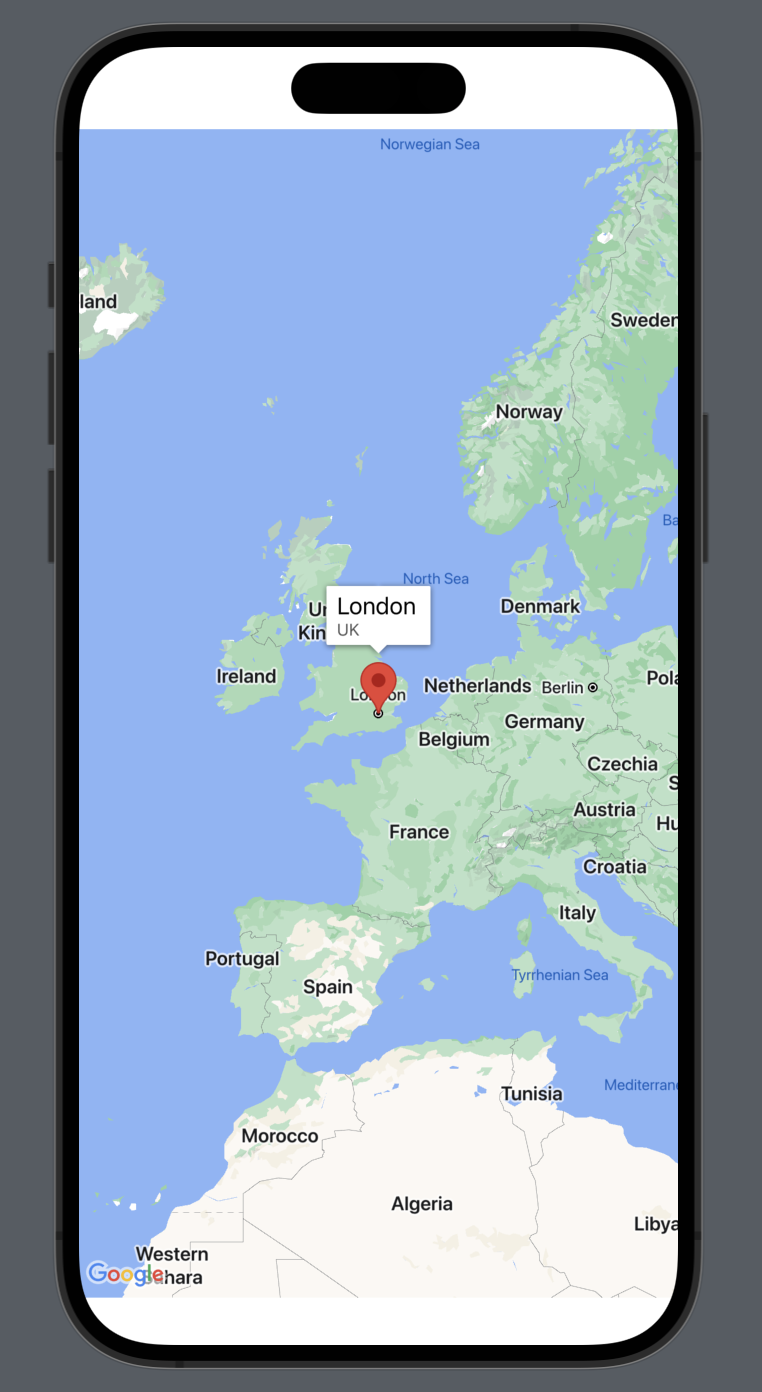 이렇게 런던에 마커가 찍혀있고 클릭해보면 위 코드에서 설정한 title과 snippet이 보이게된다.