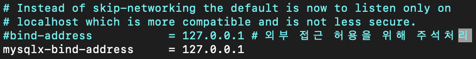 마지막으로 해당 명령어로 vi편집기를 열어 bind-address를 주석처리하여 모든 IP를 허용시킨다.