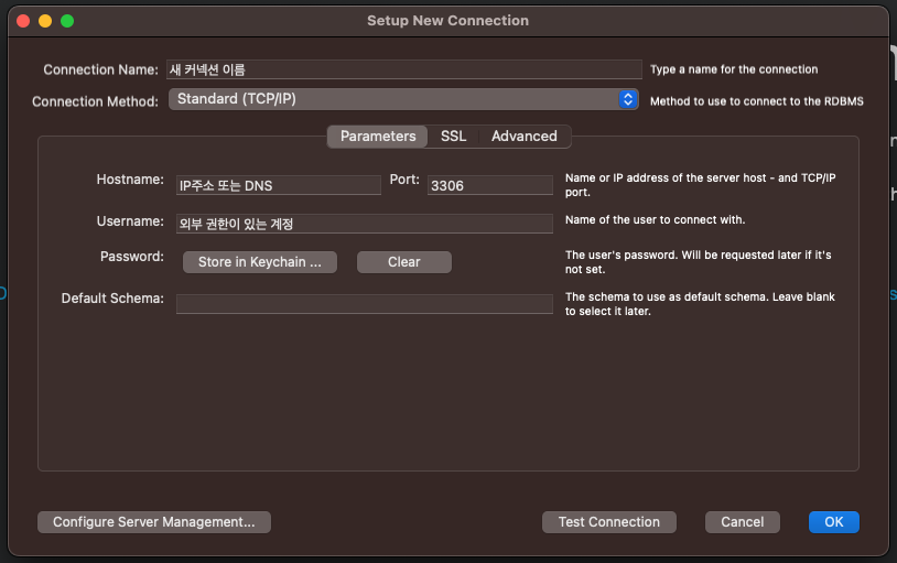 Connection Name은 자유롭게 적어주고 Hostname은 MySQL이 설치된 서버의 IP주소나 도메인이름을 적어주면 된다. Port는 3306이라면 그대로 두고 아닐경우 수정하자.