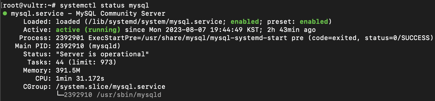 우선 위에서 설정이 바뀌었으므로 systemctl restart mysql 명령어를 통해 서버를 다시 실행시킨다. 그리고 상태가 active인지 확인한다.
