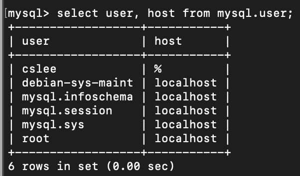 select user, host from mysql.user;