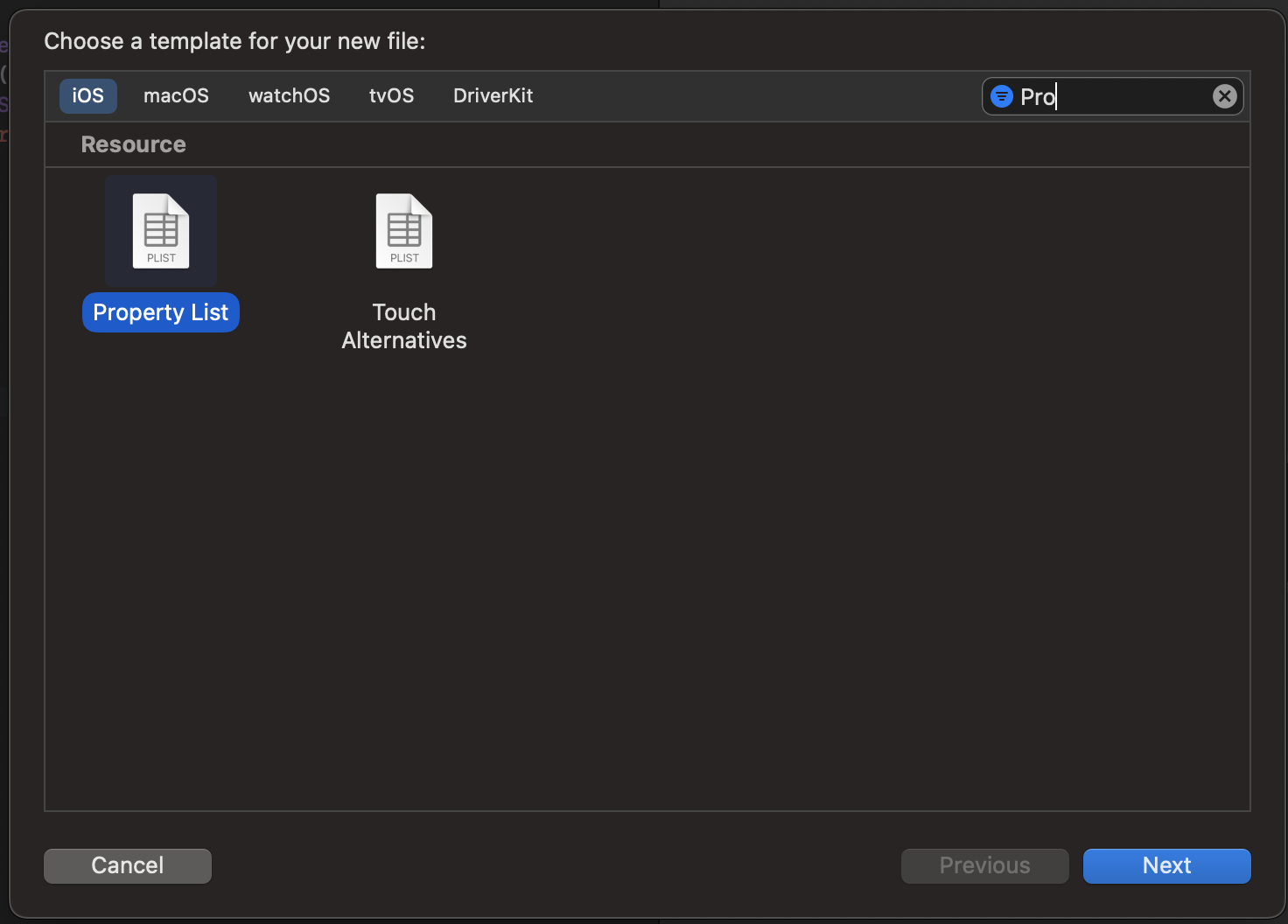 1. 프로젝트에서 File > New > File...을 클릭한뒤 Property List를 클릭한다.