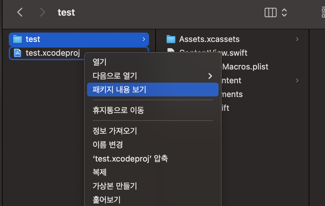 5. [프로젝트이름].xcodeproj 파일을 우클릭하여 패키지 내용 보기 클릭