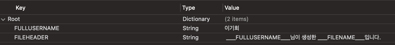 추가로 파일헤더를 수정하려면 FILEHEADER의 값을 수정하면된다. 또 다른 프로퍼티를 사용할때는 앞뒤로 언더바 3개씩 추가하여 값을 가져와서 사용할 수 있다. 사용할 수있는 프로퍼티는 요기에서 확인할 수있다.