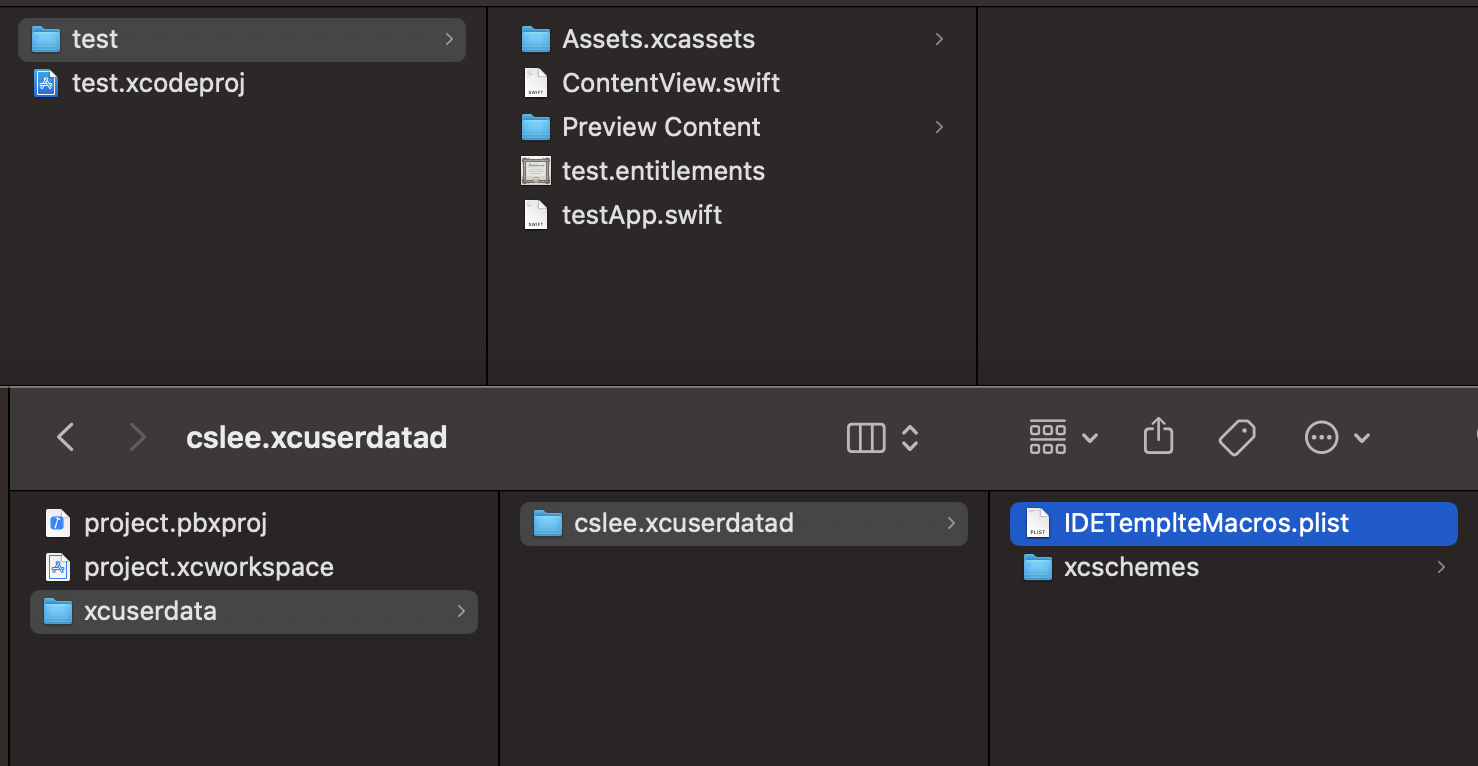 <ProjectName>.xcodeproj/xcuserdata/[username].xcuserdatad/IDETemplateMacros.plist - 단일 프로젝트에 있는 모든 팀 멤버: