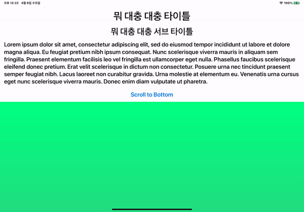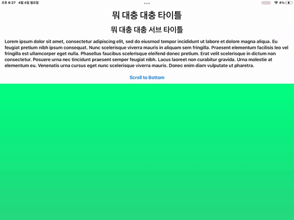 상단 샘플코드와 같은 구조. 상단 뷰의 높이(VStack)만큼 위로 말려 올라가는 버그가 있다.
